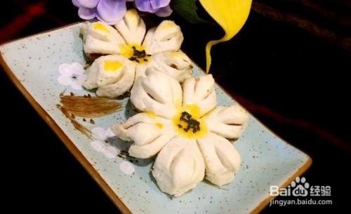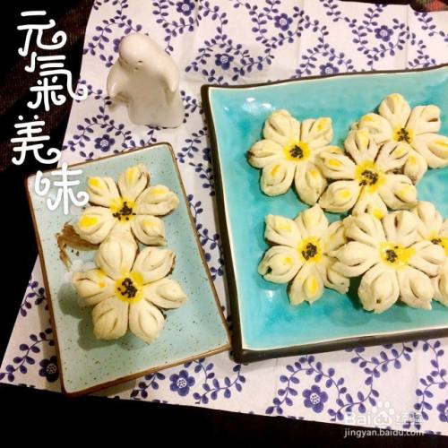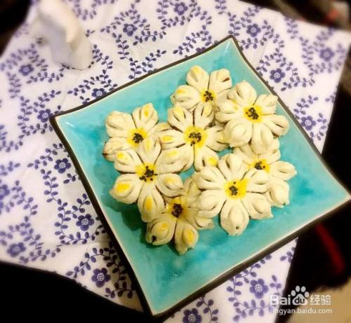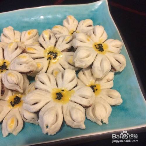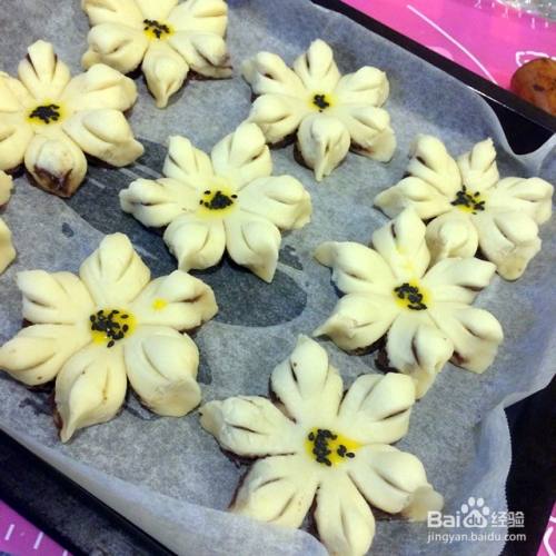 然后调上蛋黄液,在花芯处点上黄黄的蛋黄液,还可以在花瓣隆起处也点上蛋黄液,这一步自由发挥吧。最后在花芯处撒些黑芝麻,花朵完成。