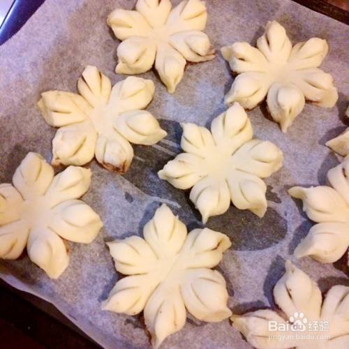 然后用手将每个角捏在一起,整理成花朵状,豆沙酥饼的雏型完成。