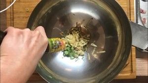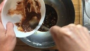 用手挤压葱姜,借料酒和酱油的液体把葱姜水挤出来