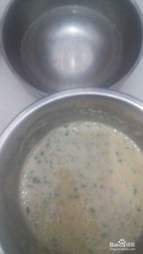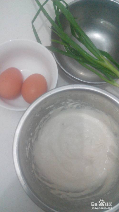 先把面粉和少量水搅成无颗粒的稠糊(头晚搅好冷藏醒一夜更好)。葱洗净切碎。(鸡蛋葱花煎饼糊原料:水230g、面100g、2个鸡蛋、一颗葱、2.5g量勺一平勺盐,实际操作要灵活。)