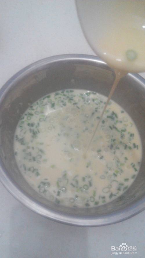打入鸡蛋,放入切碎的葱花、盐搅匀。