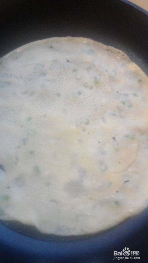 火调中小火,倒入糊,倾斜转动锅,让糊均匀摊平。炒菜锅也可以,把面糊放锅里,拿起锅转一圈就圆了,动作要快。