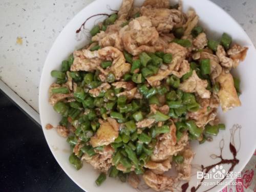 炒锅内再次加入少许的油,炸香大蒜后倒入豆角,翻炒几下后调入适量的盐、南德、生抽翻炒均匀。翻炒的时候可以加入少许的清水,以免菜糊。待翻炒至豆角7成熟的时候倒入鸡蛋块,翻炒几下后调入耗油、黄豆酱继续翻炒。最后翻炒至菜熟透就可以盛出装盘来了。