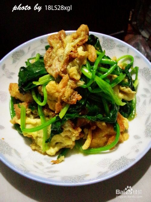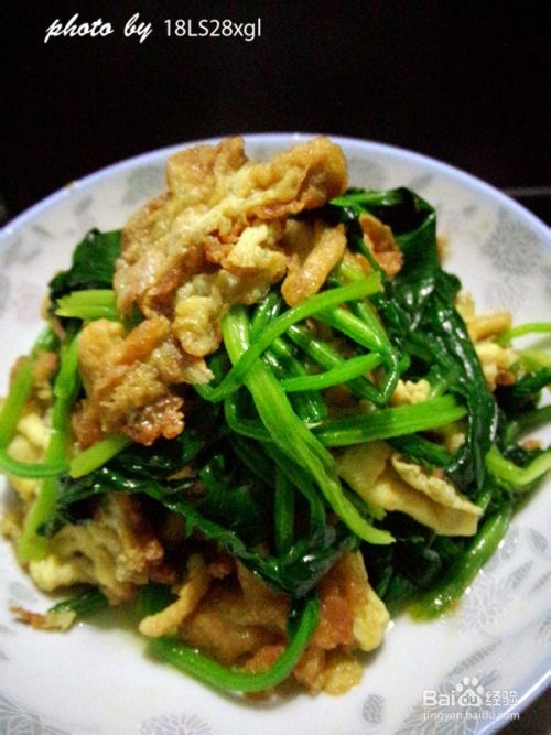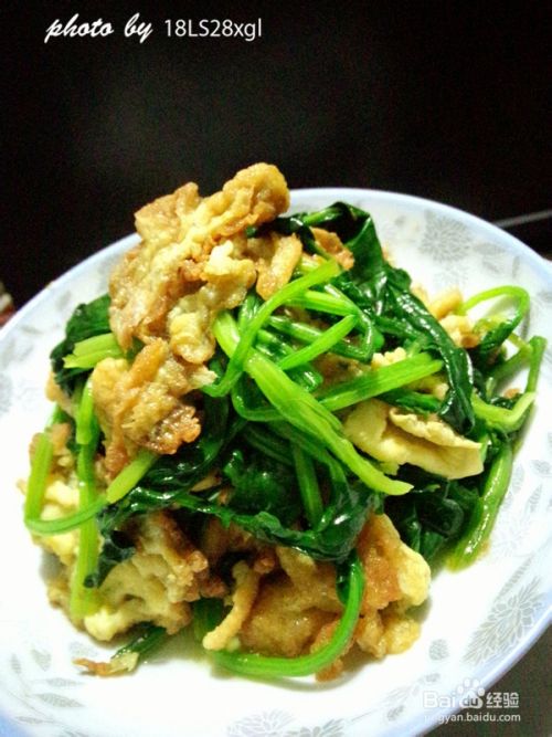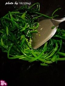 另起油锅,倒适量油烧热,将菠菜放进锅里,大火快炒2分钟后关火,调入盐、鸡精。