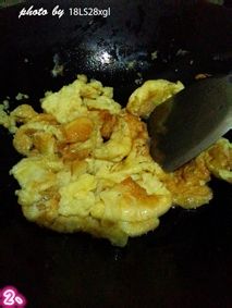 起油锅,油烧热时,将蛋液倒进锅里,用锅铲迅速将其划成一块一块的。炒熟后起锅备用。
