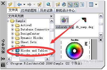 然后进入设计中心窗口。 在设计中心窗口菜单中选择【文件夹】。