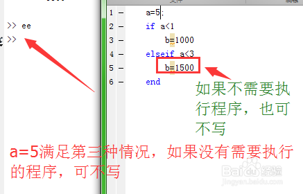 对于多个情况,可设置多个判断,对于有新判断条件的情况用elseif添加,下图所示,为3种情况,根据a的值,运行后满足第二种情况。