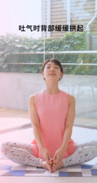 第二步,缓缓吐气,吸气的同时挺胸直背,吐气时背部缓缓拱起。