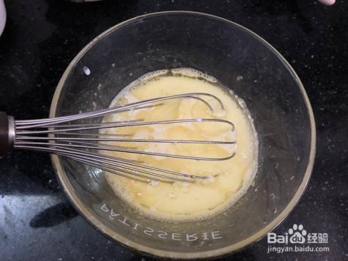 将鸡蛋打入碗中,加入细砂糖,用手动打蛋器搅拌均匀。30克细砂糖的甜度刚好,如果比较喜欢吃甜,可以适当多加一点。最好用细砂糖或者糖粉,比较容易融化。