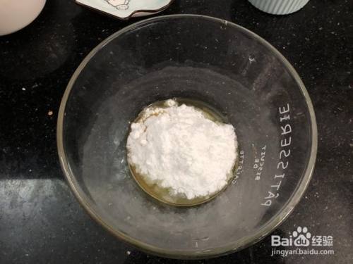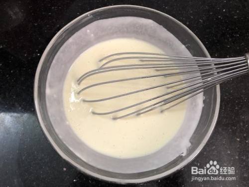 将玉米油和牛奶倒入碗中,继续搅拌均匀。