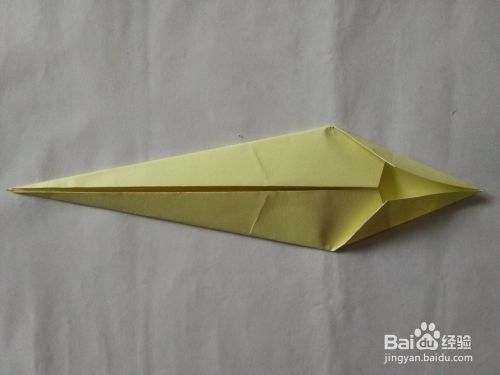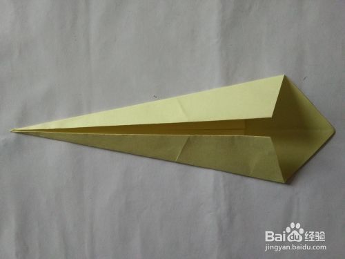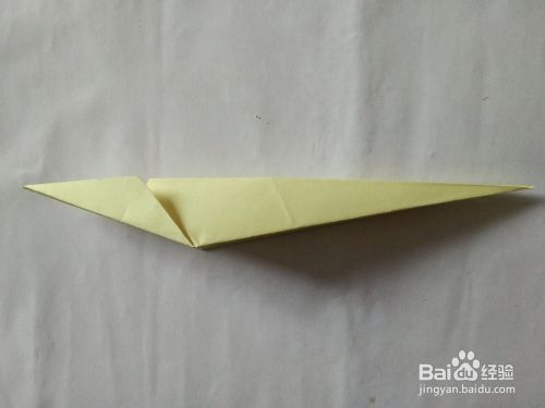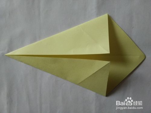 上下调转一下方法,将前面的角向下折,之后展开,沿折痕向下翻折。
