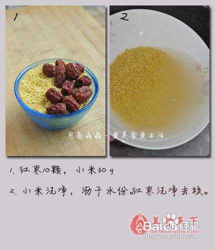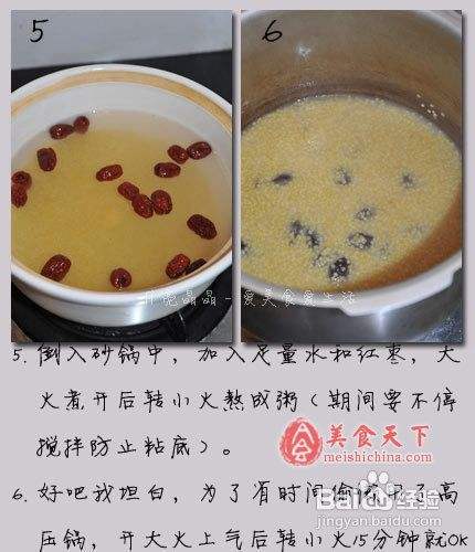 3、红枣一定要去核(因为红枣核燥火,有些人不适应),如果单纯吃枣肉是不会燥火的。小米事先炒一下,会更香,煮起来也更容易涨开并且口感更糯。