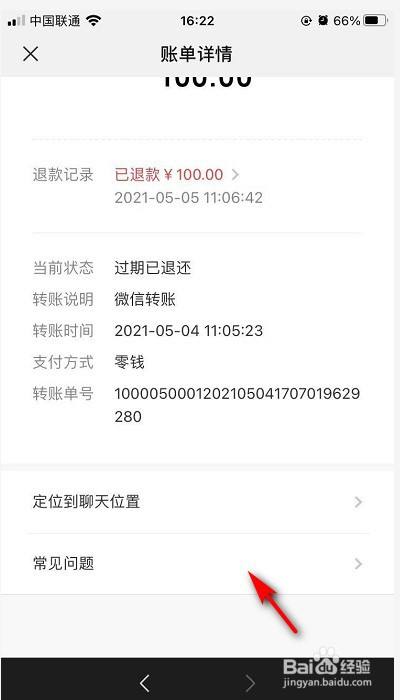 然后进入退款详情,可以看到是过期退还,点击下方的常见问题。
