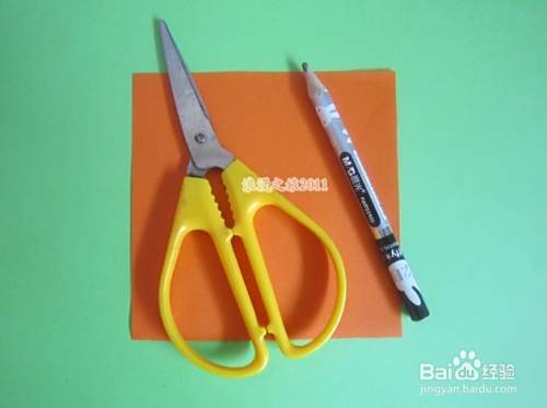首先准备一张正方形的纸,一把剪刀,一支笔,如图所示。