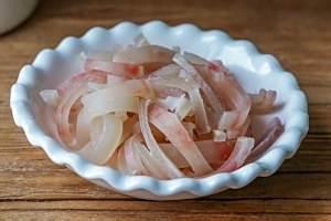把猪皮上的毛都刮干净,反复检查,确保一根不剩,再切成细条。