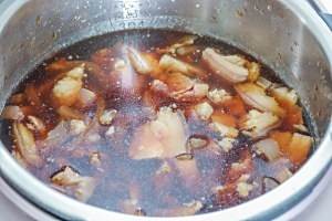 把猪蹄膀、猪皮都放进高压锅中,倒入与食材齐平的水,再倒入两勺生抽,一勺老抽,一勺蚝油,一勺料酒,三到四片生姜。选择炖肉模式,连压两次。