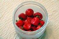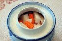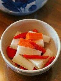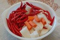红白萝卜用湿毛巾擦干净后去皮,切小长方块。小红椒去蒂后用湿毛巾擦干净。全部蔬菜晾干