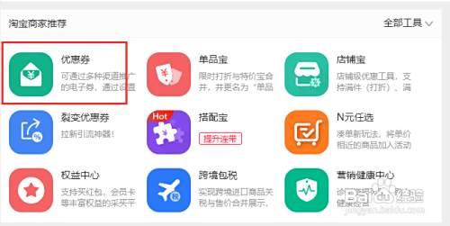 在【淘宝商家推荐】中,选择【优惠券】。这个需要根据个人需求订购一下的。