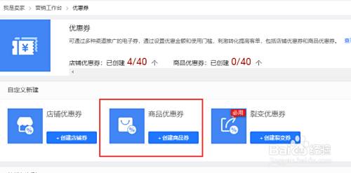 进去之后会看到3种类型的优惠券,我们选择中间的【商品优惠券】,创建优惠券。