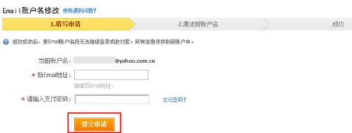 输入新的邮箱地址和支付密码,点击【提交申请】(若提示邮箱已经被占用,是由于该邮箱已注册了阿里巴巴集团下的网站账户,如淘宝、支付宝、阿里巴巴网站等,建议您更换新邮箱即可。);