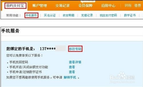打开www.alipay.com,登录支付宝账户,点击【手机服务】——【修改号码】;