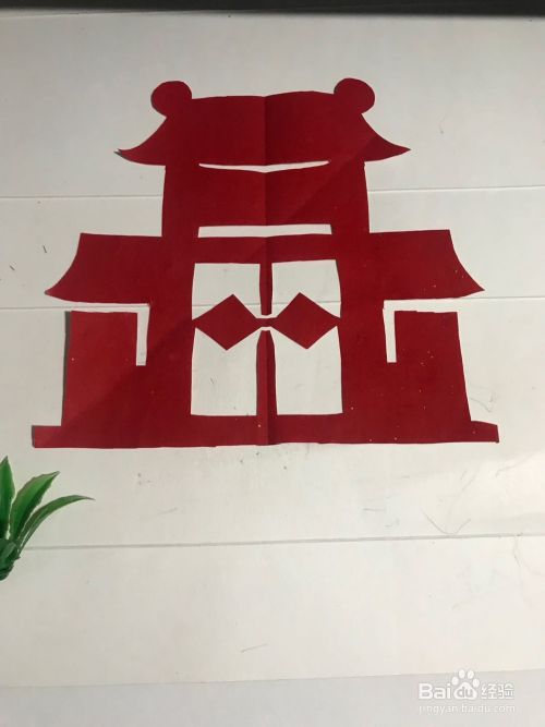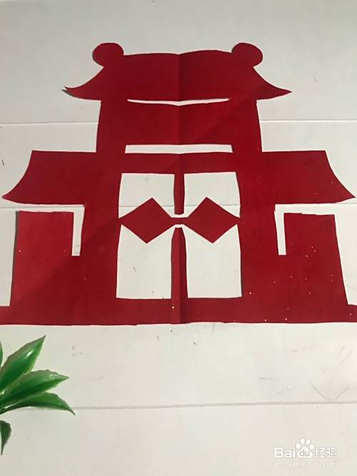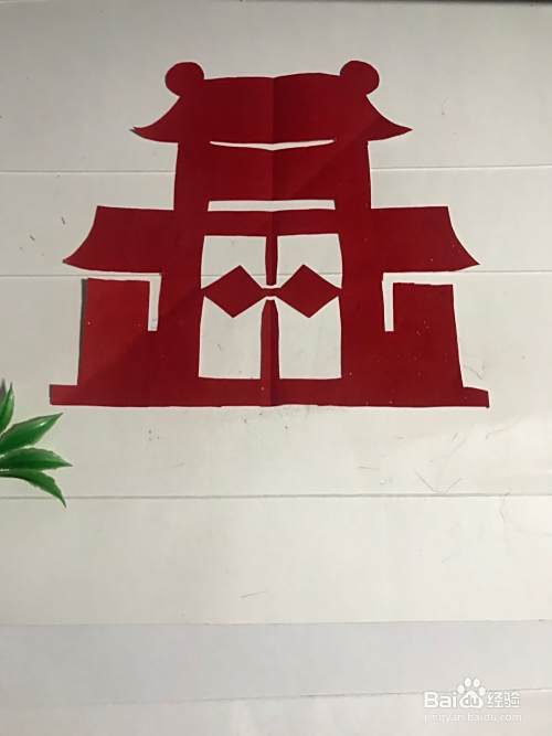 第六步 剪完外围多余的彩纸之后 再剪里面的细节部分和镂空的部分 还有其它涂实的部分 全部剪完之后展开铺平 一座漂亮的古代小门楼就裁剪完成了