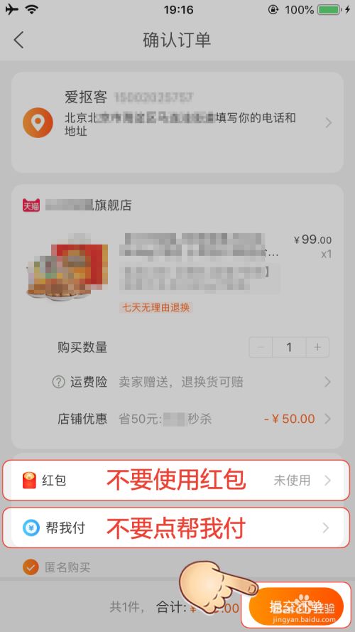 手机淘宝打开您要购买的商品,不要使用红包,不要点【帮我付】按钮,提交订单。