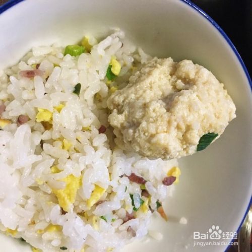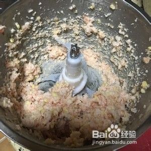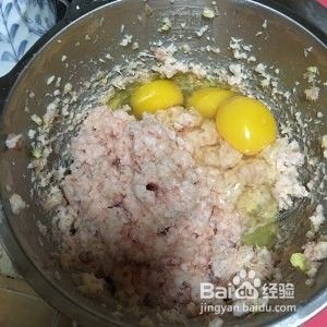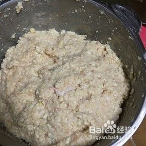将搅好的肉放在一个容器内,再加入三个生鸡蛋,老豆腐一块,盐1-2小勺,豆粉2-3小汤匙