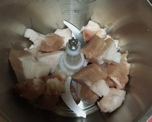先把猪肉(我用的前夹肉,因为带点肥肉会更香)切成小块,放入绞肉机