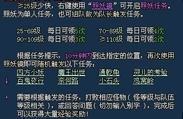照妖只要等级大于25就可以玩了,这个是没有什么难度的任务,组上队六个人,照妖的时候一人当一次队长,轮流开始照