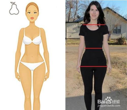 梨形身材的特点就是胯宽、肩窄、腰细。 胯宽>腰宽>肩宽