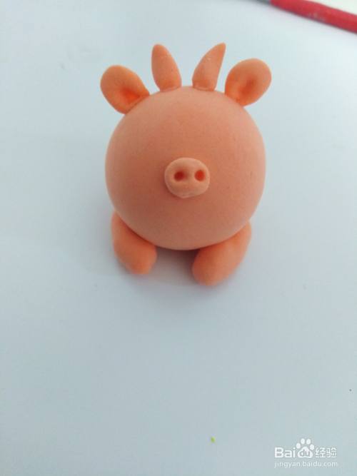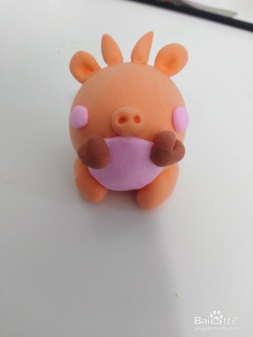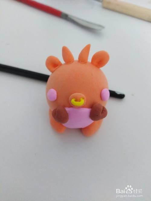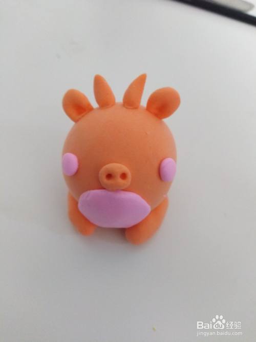 同色粘土另取一小块,搓成圆球后粘在脸部正中,然后借助工具戳出两个鼻孔,制作牛鼻子