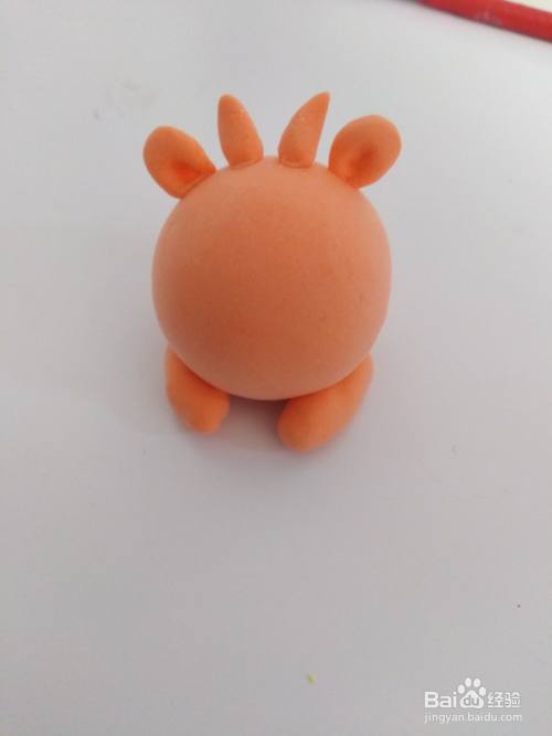 取小团粘土,分成四份,分别制作小牛的两个牛角和两个耳朵,粘在对应的位置