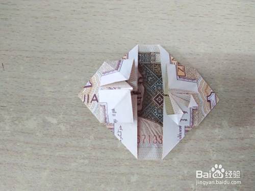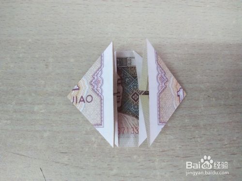 顺着折痕将人民币的一段折下面第一个图的形状,另一边也是一样的折法。