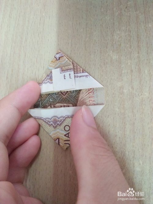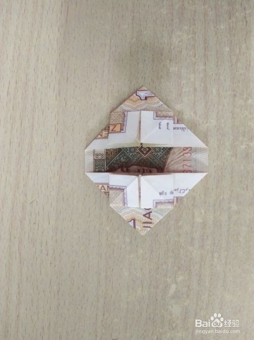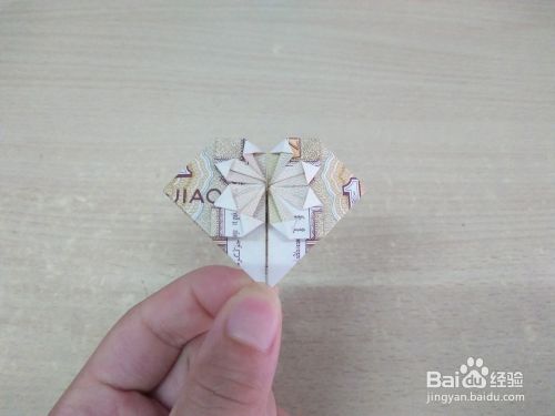 到此步骤时,人民币呈菱形。将菱形的上部分往后翻,翻后如下面第二张图所示。为了让心形美观,将心形最下面的尖端往后折。