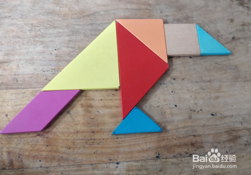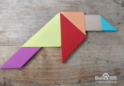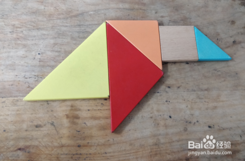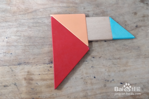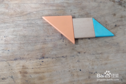 摆上蓝色三角形,放在红色三角形的下面挨着,如图。这样就拼组好了。