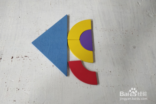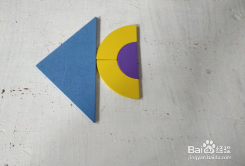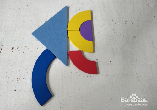 摆上蓝色长弧形,放在三角形下面挨着,如图。