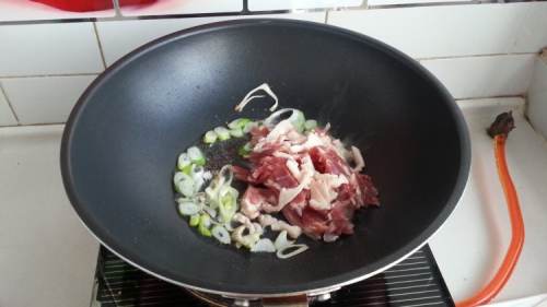 5下入肉丝,炒至变色。