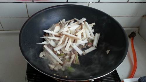 6下入杏鲍菇,炒软。