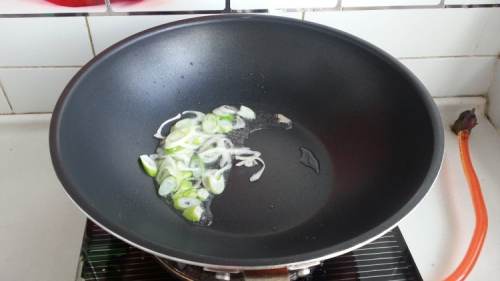 4锅加油,烧热后,下入葱花,炒出香味。