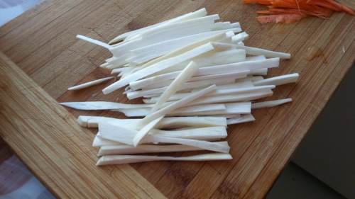 1杏鲍菇切成粗丝。