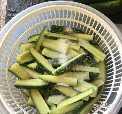 切好的黄瓜条加大把盐腌制,要把黄瓜多余的水分腌制出来