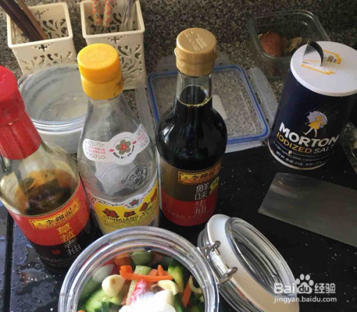 把黄瓜放进罐子加两勺盐,一勺糖,适量生抽,适量老抽和一大勺陈醋