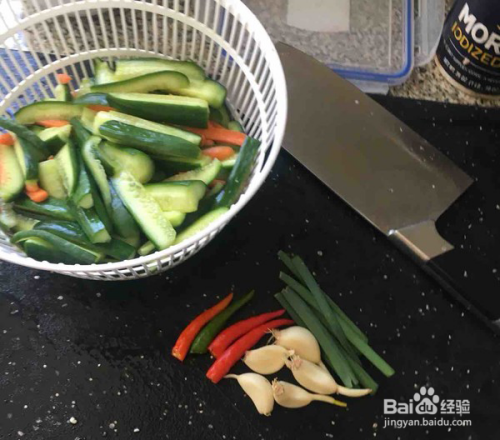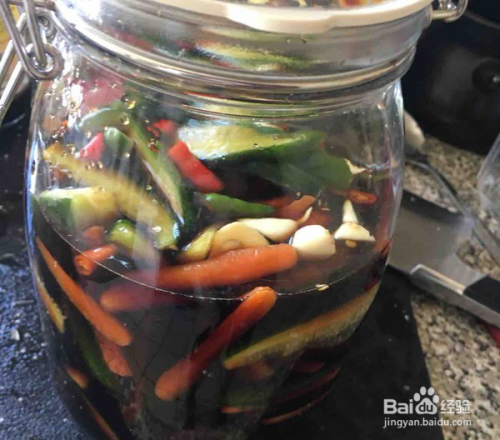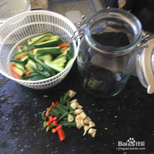准备一个洗净晾干的玻璃罐子,一定要可以密封的,照片照的模糊了点,腌制20分钟的黄瓜去水洗净,放进罐子