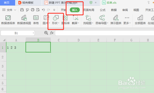 打开WPS表格,输入数字(1.2.3等)点击上方的插入-形状。