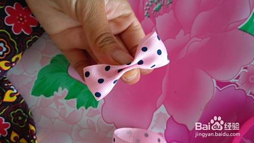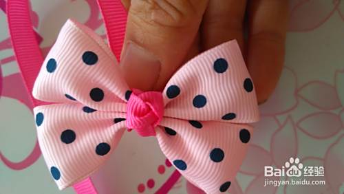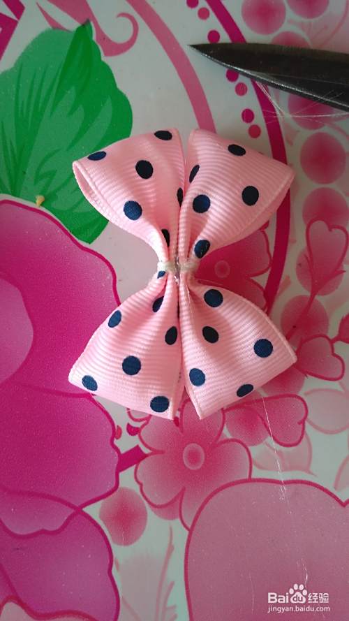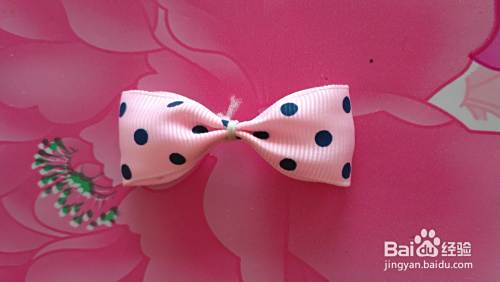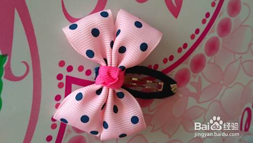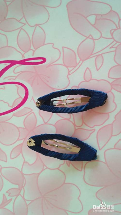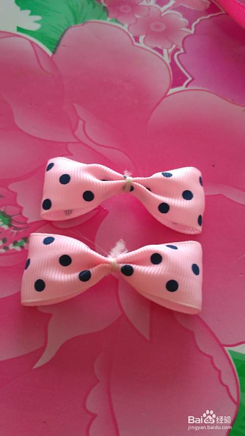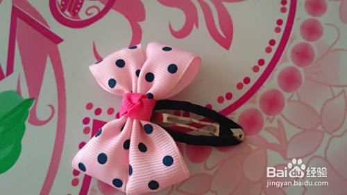 用热熔胶把丝带粘在蝴蝶结中心缠绕固定(如图),用剪刀剪掉多余部分,用打火机烧下边缘。再用热熔胶把蝴蝶结粘在水滴夹上固定(如图),可爱的水滴夹就制作完成了。