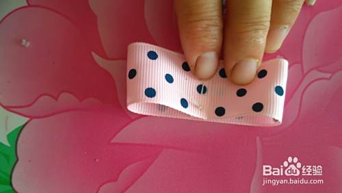 按丝带缝合处做中心点按压(如图),按中心向上对折(如图)。