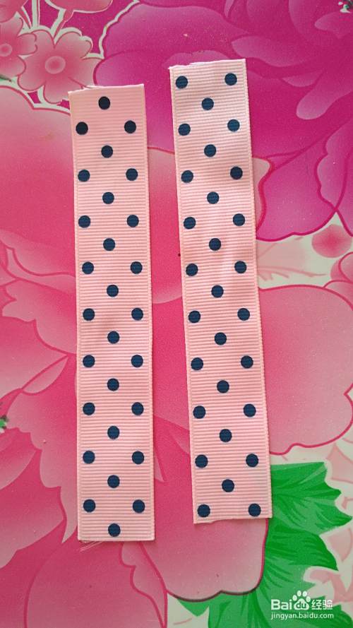 2.5丝带用剪刀剪出两条,每条丝带长14厘米,用针线把丝带两端缝好(如图)。