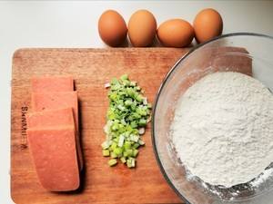 准备好所有食材 :火腿肠➕鸡蛋➕面粉➕水➕葱花➕豆瓣酱。