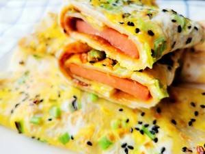 放上煎好的火腿肠(也可以加上自己喜欢的其他的菜哦) 沿一边卷起来就好啦。